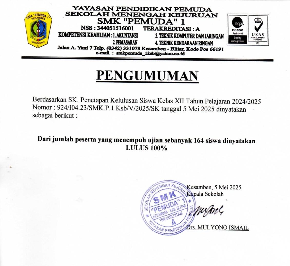 PENGUMUMAN KELULUSAN SISWA-SISWI SMK PEMUDA 1 KESAMBEN